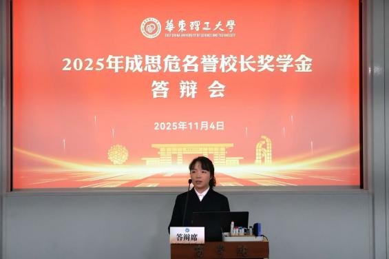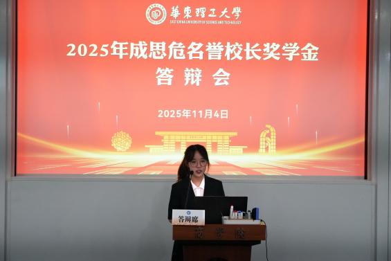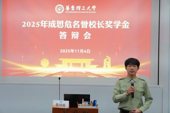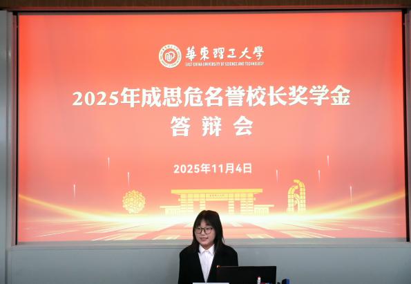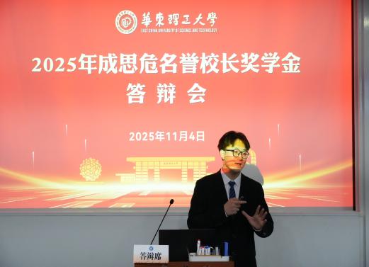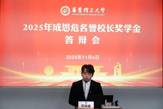 为深入学习贯彻党的二十大和二十届四中全会精神,全面落实学校第十二次党代会人才培养要求,紧扣“立报国强国大志向 做挺膺担当奋斗者”育人主题,传承“勤奋求实,励志明德”的校训精神,11月4日,华东理工大学2025年成思危名誉校长奖学金答辩会顺利举行。答辩会采取线下评审的形式,邀请部分兄弟高校嘉宾与企业嘉宾担任评委。经过多轮评审与精彩角逐,信息科学与工程学院李佳强、化学与分子工程学院董绎文等18