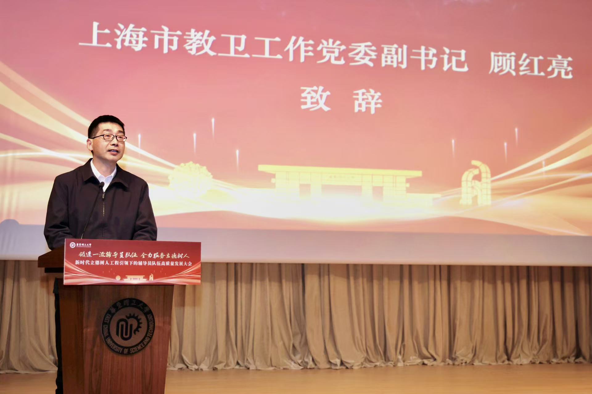 为深入学习贯彻习近平总书记关于教育的重要论述,贯彻教育部2026年度高校思想政治工作研讨会暨立德树人机制综合改革试点推进会精神,树立和践行正确政绩观,全力锻造一流辅导员队伍,3月25日,学校在徐汇校区举办“新时代立德树人工程引领下辅导员队伍高质量发展大会”。上海市教卫工作党委副书记顾红亮,宣传处处长、德育处处长朱敏,校党委书记蒋传海,党委副书记沈海涛、龚跃,复旦大学、南京大学等兄弟高校思政专家,校企合作单位代表,学校相关职能部门负责人,各学院分管学生工作负责人,以及全体专兼职辅导员等参加活动。